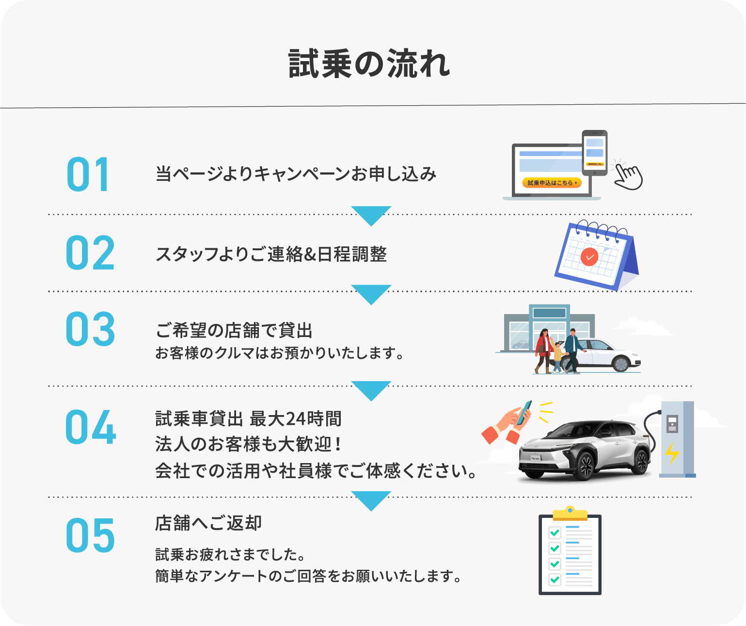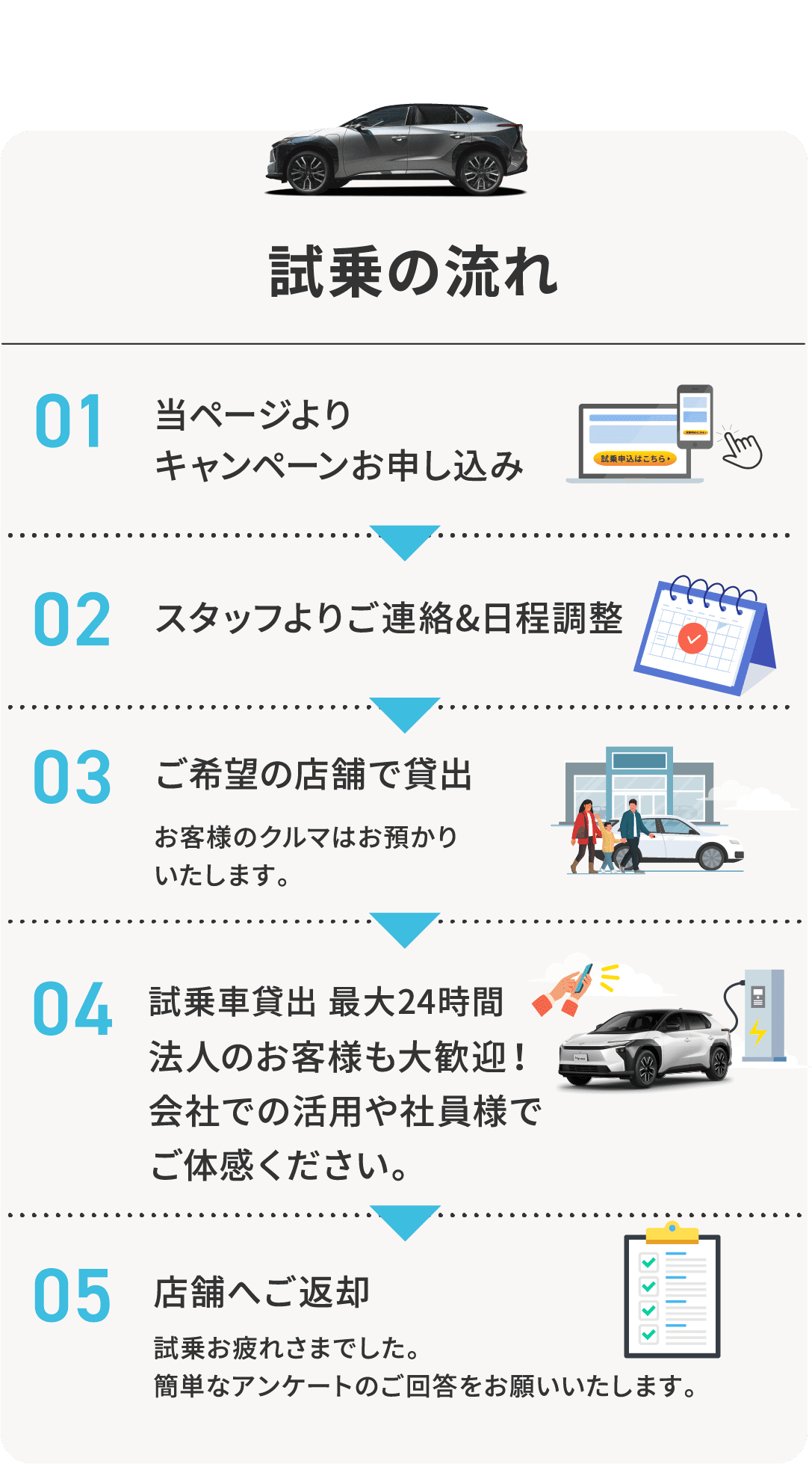 2.指定の店舗へ貸出期間中にご来店の上、借受・返却ができる方、試乗終了後にアンケートにご回答いただける方に限ります。